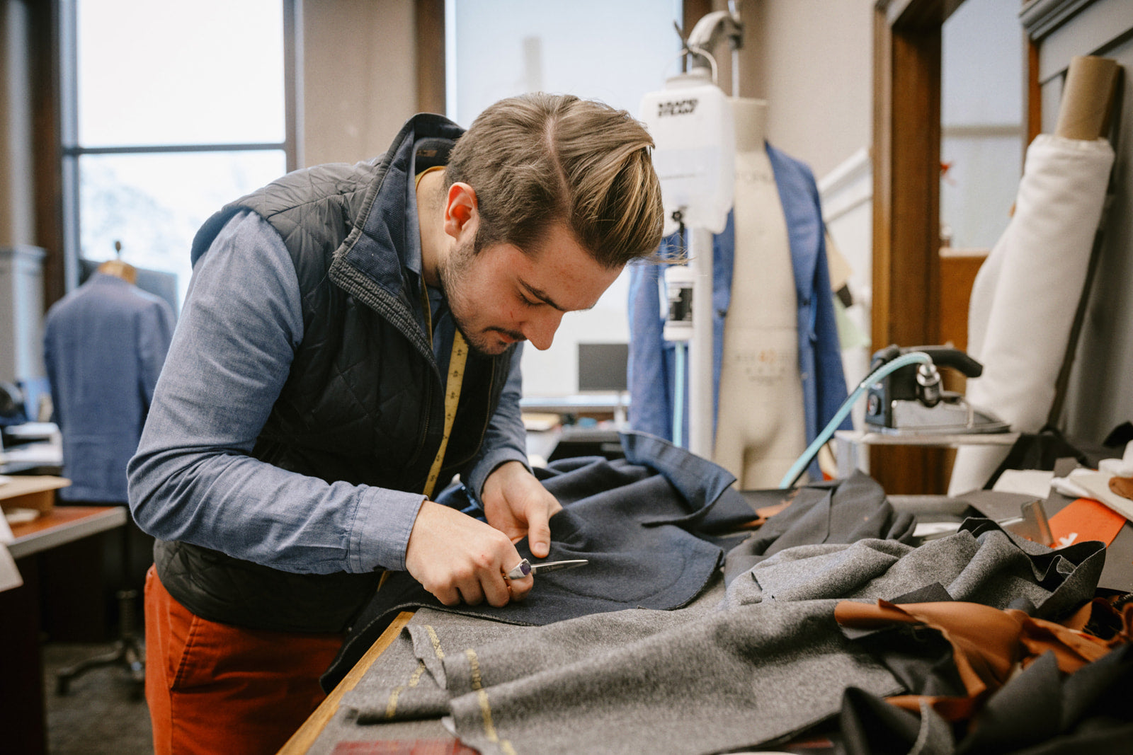 Our Whisper Sport Coats are meticulously crafted in Rochester, New York by the oldest and most esteemed tailored manufacturer in the country. Every aspect of the production journey, including cutting, sewing, trimming, pressing, folding, and packaging, is carried out manually by adept artisans who possess generations-worth of wisdom and skill.
